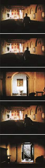 Al promediar el primer acto de Vértigo, Scottie y Madeleine se besan en el establo de la misión jesuítica San Juan Bautista. Ella se muestra perturbada, mira en dirección a la iglesia y sus labios abandonan los de Scottie. Vacilante, le dice que es demasiado tarde para su incipiente amor y rehúye los brazos del héroe; precipitándose a la carrera hacia la iglesia. Scottie va tras ella, la detiene antes del ingreso al templo, se besan nuevamente y Madeleine le reitera que lo ama y que recuerde siempre eso. Le pide que la deje entrar sola a la iglesia y antes de ingresar dirige su mirada hacia lo alto. Scottie otea la trayectoria de los ojos de Madeleine, descubre el campanario y entiende que la mujer se encamina hacia la cima de la torre. Temiendo lo peor sigue sus pasos, atraviesa la puerta de la iglesia, accede a la nave principal y desesperado intenta hallar la escalera que conduce al fatídico destino de la amada mujer. Primero mira a su derecha y descubre un pórtico que conduce al baptisterio, en el centro de la habitación se eleva una pila bautismal y en la pared un cuadro del bautismo de Jesús (Jesús de rodillas y San Juan Bautista de pie derramando agua en la cabeza de Jesús). Luego mira a su izquierda y por fin da con la escalera y se lanza al fallido rescate. El breve instante en que el héroe se encuentra en el medio de esos dos caminos es cifra del estado metafísico de Scottie, que Hitchcock ya había dejado pendiendo del tejado de un edificio, suspendido en el vacío ante la posibilidad de caer y morir (descenso), y de subir y salvarse (ascenso), ésta tensión arriba-abajo se troca en este segmento de la escena por una tensión derecha- izquierda[2]. Al optar por la vía izquierda, único camino posible para nuestro héroe, confronta con su propia acrofobia y así con la imposibilidad de ascender que se transmuta, como vimos, en un franco descenso al inframundo. El plano, escueto pero significativo, del pórtico que da al baptisterio, plano que por supuesto es orgánico y está cabalmente integrado a la Mise-en-scène, desvía por un momento la atención de Scottie de su misión. El baptisterio se presenta enfrentado en espejo a la vía que debe tomar nuestro héroe, como una bifurcación que despliega una segunda posibilidad. La construcción y la significación de los baptisterios están íntimamente ligadas a la simbología del número ocho y especialmente del octógono. La doble espiral que configura la grafía del número ocho con su doble movimiento de ascenso y descenso sobre un eje vertical imaginario guarda una estrecha relación con el simbolismo que se manifiesta en el bautismo, representado en el octógono como figura mediadora entre lo terreno y lo celeste, el arriba y el abajo. En la tradición cristiana era común construir los baptisterios con forma octogonal, “…la bóveda circular no puede reposar directamente sobre la base cuadrada, y para permitir el paso de uno a otra hace falta una forma de transición que sea, en cierto modo, intermedia entre el cuadrado y el círculo (…) para realizar esta cuadratura del círculo, que va de la unidad celeste de la bóveda al cuadrado de los elementos terrestres, es menester pasar por el octógono, que se halla en relación con el mundo intermedio…”[3]En el bautismo los movimientos de ascenso y descenso son equivalentes a la inmersión y emersión en las aguas bautismales. Este doble flujo de ascenso-descenso, inmersión-emersión están relacionados con otro par de movimientos que operan en la psiquis[4] del neófito en el momento de la ablución: purificación-regeneración y muerte-vida[5]. “El ‘hombre viejo’ muere por inmersión en el agua y da nacimiento a un nuevo ser regenerado. Este simbolismo lo expresa admirablemente Juan Crisóstomo, quien, a propósito de la multivalencia simbólica del bautismo, escribe: ‘Representa la muerte y la sepultura, la vida y la resurrección... Cuando sumergimos nuestra cabeza en el agua como en un sepulcro, el hombre viejo queda inmerso, sepultado por completo, cuando salimos del agua, el hombre nuevo aparece simultáneamente’.”[6]